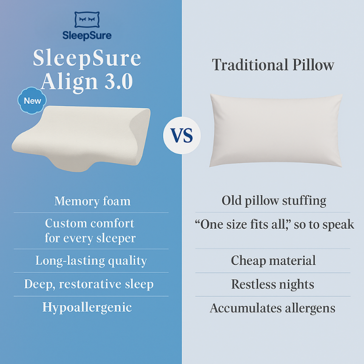 We often think about improving our posture during the day. But it’s actually built while we sleep — a third of our lives. The wrong pillow can misalign your neck, compress your spine, and create invisible tension… that you feel during the day. The SleepSure Align 3.0 Pillow is designed to naturally align your head, neck, and spine throughout the night, effortlessly. Less tension, better posture, lighter mornings — and comfort you can feel from the very first night.
